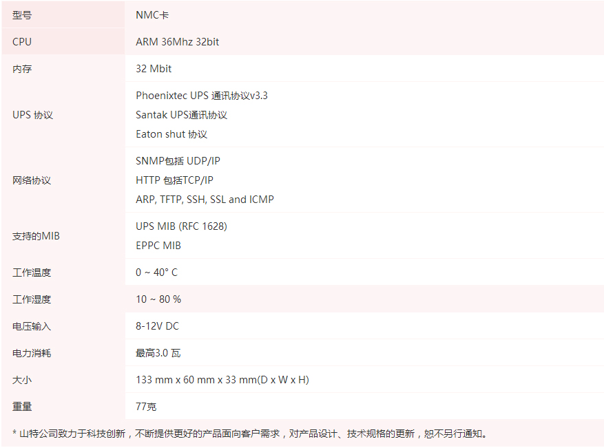 NMC 是一种介于UPS和网络的设备,它可以从UPS获得状态信息并且发出指令。NMC支持两种协议-简易网络管理协议(SNMP)和超文件传输协议(HTTP)以供使用者进入。通过SNMP的网络管理站(NMS)和网页浏览器,用户可以获得UPS的状态信息、发出指令至UPS并且通过网络设定NMC。